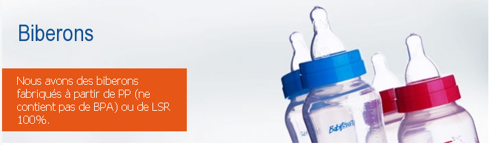 Nous avons des biberons fabriqués à partir de PP (ne contient pas de BPA) ou de silicone liquide 100%. Nous avons aussi les modéles alternatifs de différents volumes, motifs et types.
